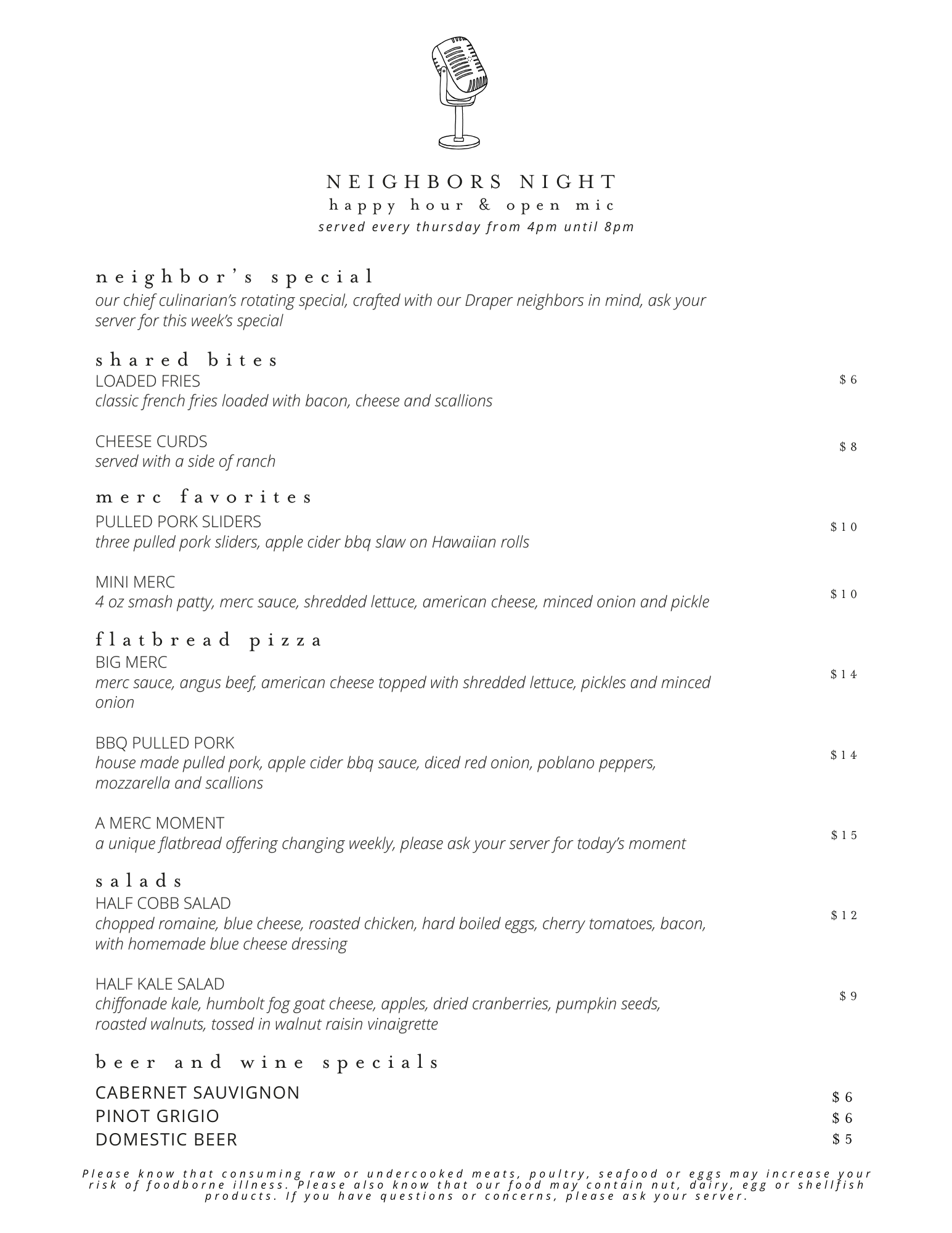 Join us for Open Mic and Neighbors Night on Thursday 6PM to 8PM and for Wine Down Friday (free live music) on Friday from 5PM to 8PM