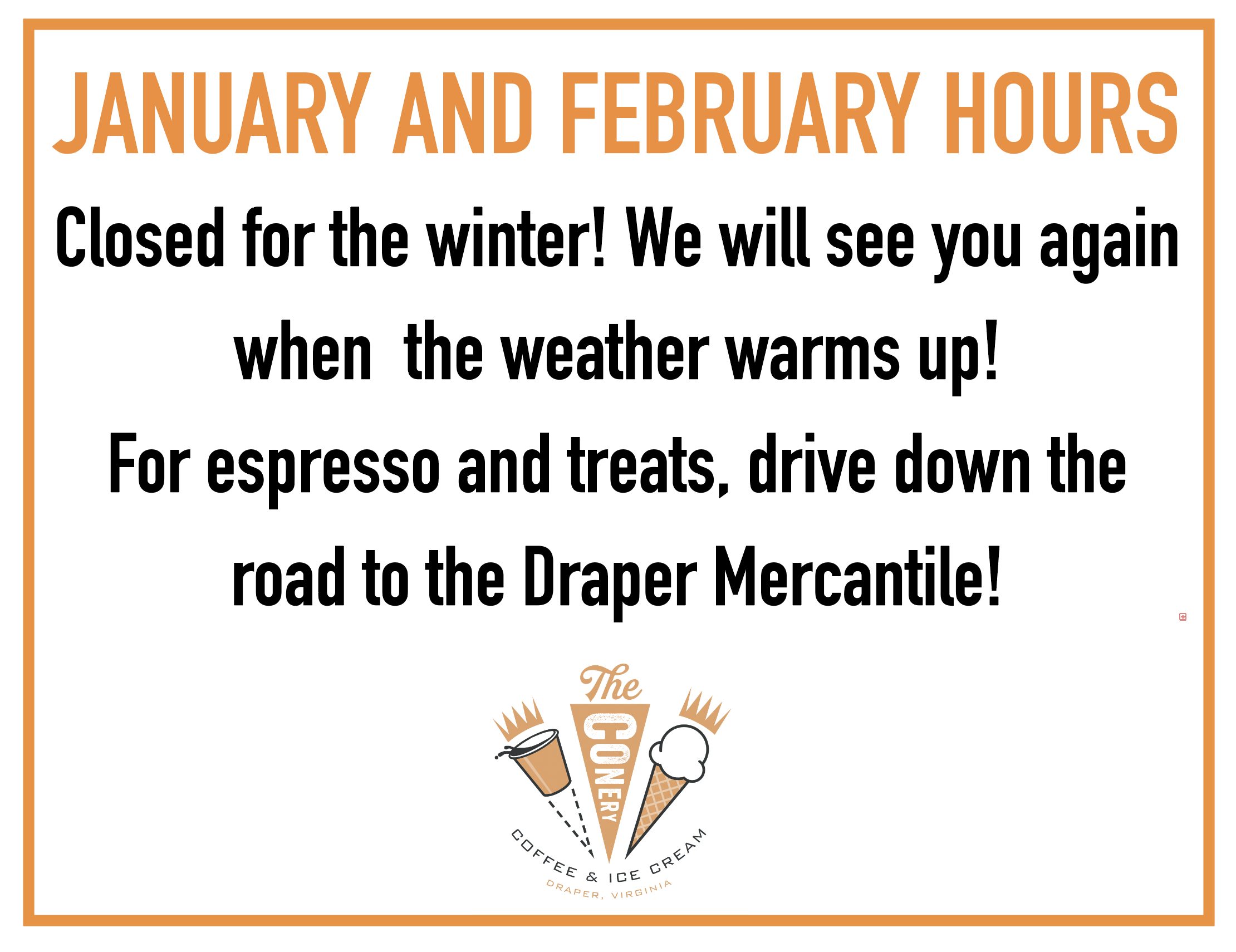 We will be closed for the month of January and February. We are excited to see you when the weather warms up!